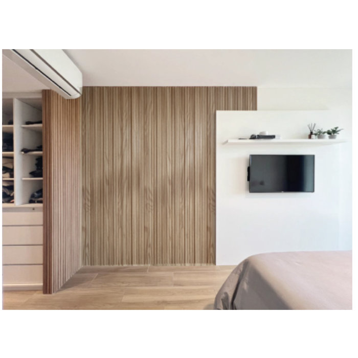Panel de muro interior, con un rápido sistema de ensamble para interior de casas, dormitorios, oficinas, locales comerciales, etc. y que le da a tu espacio un ambiente moderno de madera natural.